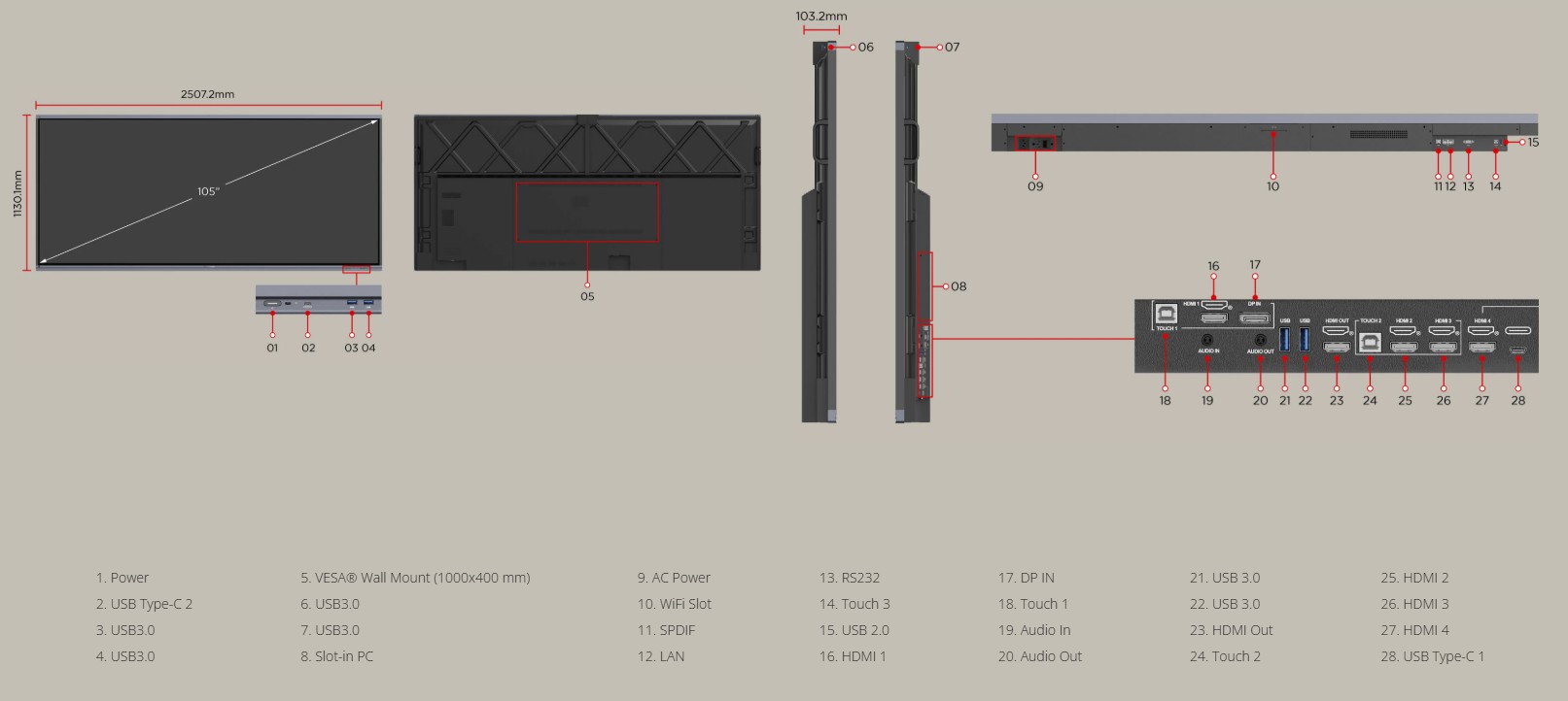Design ViewBoard IFP105UW zaměřený na uživatele zajišťuje snadný přístup ke všem portům I/O. Přední panel je vybaven dvěma USB sloty pro rychlé připojení a přepínání mezi flash disky a všestrannou konektivitu doplňuje jeden přední a jeden boční port USB-C. Stačí připojit notebook k jednomu z nich a okamžitě můžete využívat výhody nabíjení, rychlého přenosu dat, multimediálního vysílání a ethernetu.