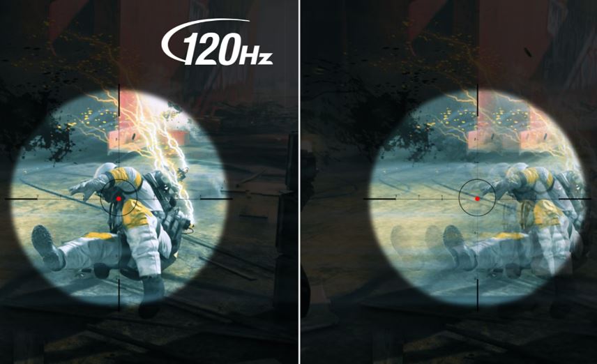 Vychutnejte si mimořádně plynulý obraz bez blikání díky obnovovací frekvenci 120 Hz. Tato funkce umožňuje plynulé přechody mezi kontrastními barvami, snižuje zpoždění vstupu a namáhání očí a zajišťuje tak svižnější a pohodlnější sledování.