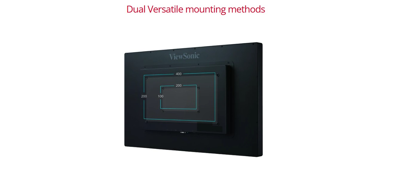Díky konstrukci s možností montáže na VESA 200 x 100 mm a 400 x 200 mm lze tento displej s otevřeným rámem snadno a bezpečně připevnit na jakýkoli povrch. Lze jej instalovat v různých orientacích – horizontálně, vertikálně nebo lícem nahoru – podle vašich preferencí a úhlu pohledu.
