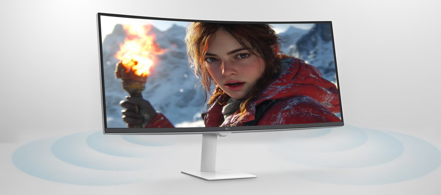 Monitor je vybaven dvěma vestavěnými stereofonními reproduktory o výkonu 7 W, které poskytují pohlcující zvuk pro filmy, hudbu a další multimediální obsah a také podporují čistou hlasovou komunikaci při videohovorech a konferenčních hovorech bez nutnosti použití externích reproduktorů.