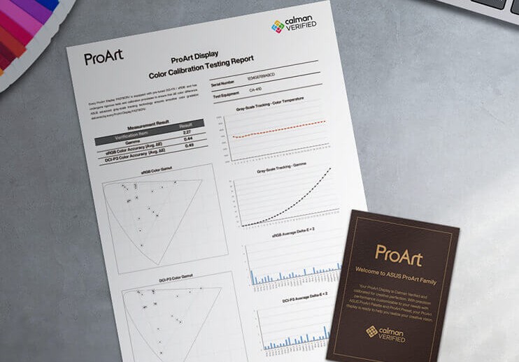 Profesionálové v oblasti barev se spoléhají na displeje s přesným podáním barev, aby měli jistotu, že jejich výtvory budou vypadat přesně tak, jak zamýšleli. Každý displej ProArt je kalibrován ve výrobě tak, aby splňoval standardy Calman Verified a dosahoval přesnosti barev Delta E<2.