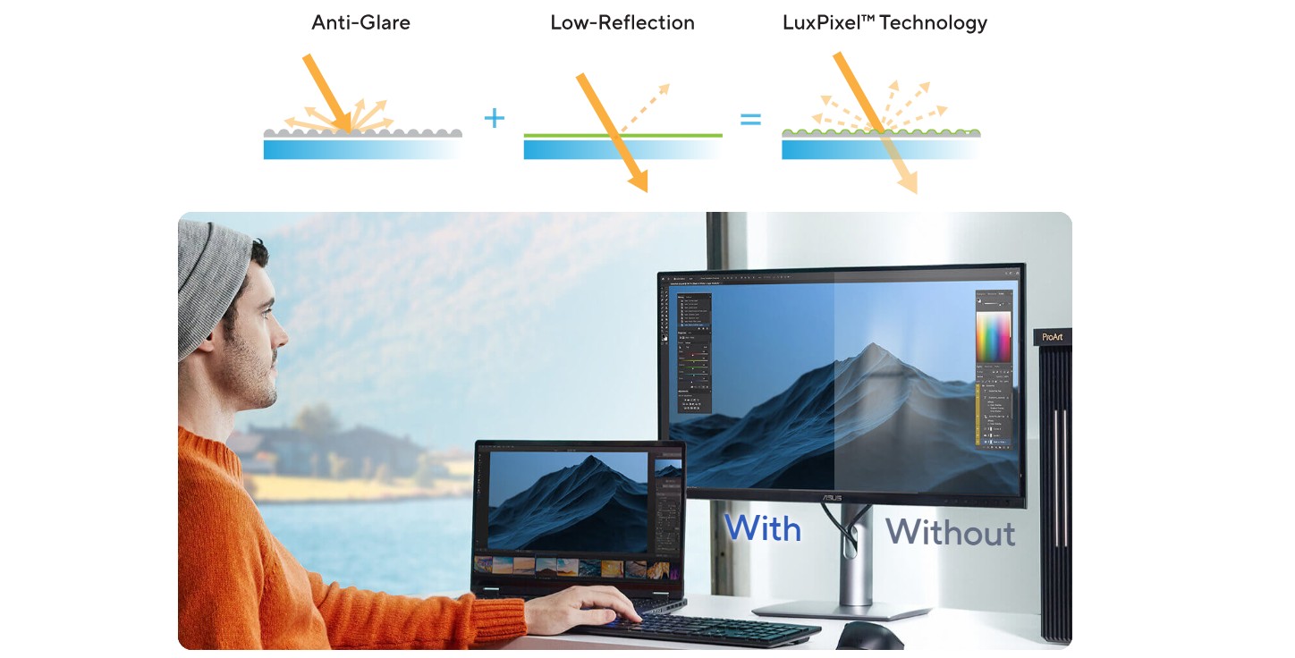 Technologie LuxPixel™ je antireflexní vrstva s nízkým odrazem (AGLR), která poskytuje efekt obrazovky podobný papíru. Na rozdíl od tradičních matných panelů, které často zobrazují měkčí obrázky, technologie LuxPixel™ minimalizuje odrazy, aby uživatel viděl pouze přesné barvy a ostré detaily.