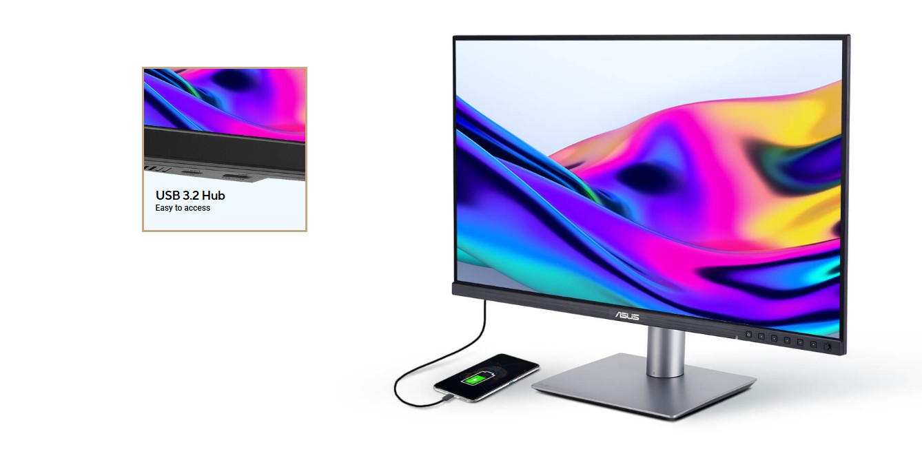 Integrovaný rozbočovač USB 3.2 podél spodního rámečku monitoru PA32QCV obsahuje jeden port USB typu A a jeden port USB-C, což umožňuje snadné připojení k celé řadě zařízení a periferií, jakož i k zařízením kompatibilním s nabíjením.