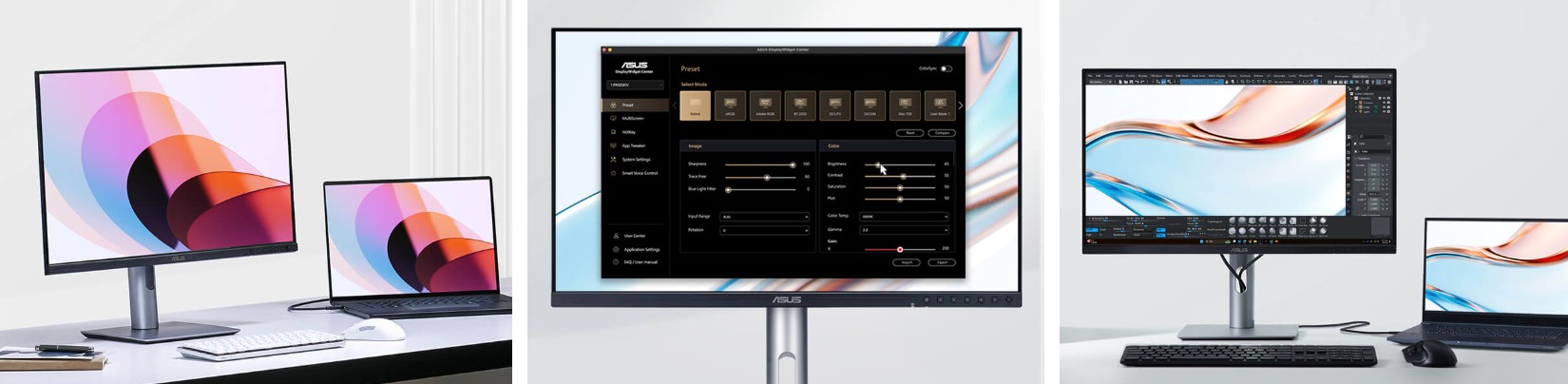 ASUS DisplayWidget Center je software, který poskytuje intuitivní rozhraní pro nastavení monitoru, včetně jasu, kontrastu a teploty barev. Ať už je monitor používán pro každodenní sledování nebo pro profesionální kreativní práci, uživatelé mohou snadno najít optimální nastavení displeje pro vylepšený zážitek ze sledování.