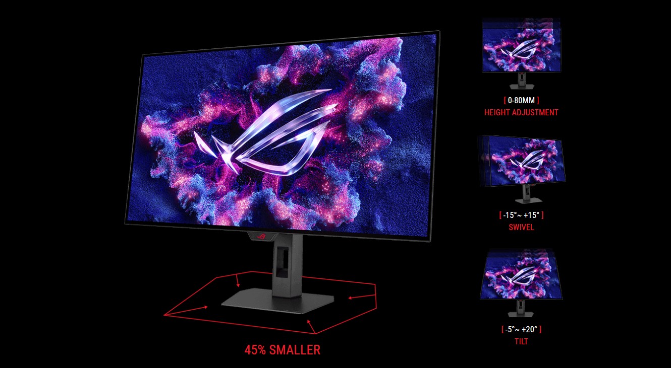 Nové monitory řady ROG Strix OLED jsou vybaveny novým kompaktním stojanem, který je o 45 % menší než stojany u monitorů XG předchozí generace, čímž uvolňují cenný prostor na stole pro klávesnici a myš. Stojan umožňuje nastavení sklonu, otočení a výšky pro ideální polohu při sledování. Displej je také kompatibilní s nástěnným držákem VESA.
