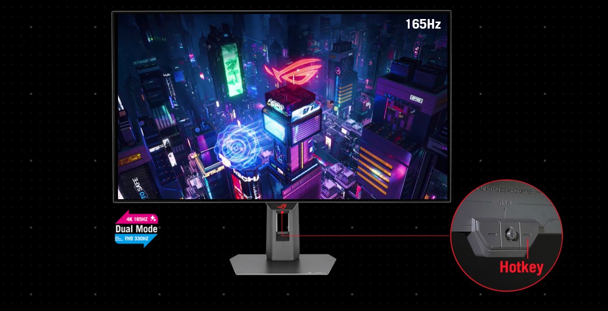 ROG Strix OLED XG32UCWG nabízí bezkonkurenční flexibilitu díky funkci duálního režimu, která uživatelům umožňuje upřednostnit obnovovací frekvenci pro rychlou akci nebo extrémní rozlišení pro pohlcující vizuální zážitek. Jediným stisknutím klávesové zkratky můžete okamžitě přepínat mezi úchvatným obrazem 4K@165Hz pro AAA tituly a bleskově rychlým FHD@330Hz pro FPS hry.