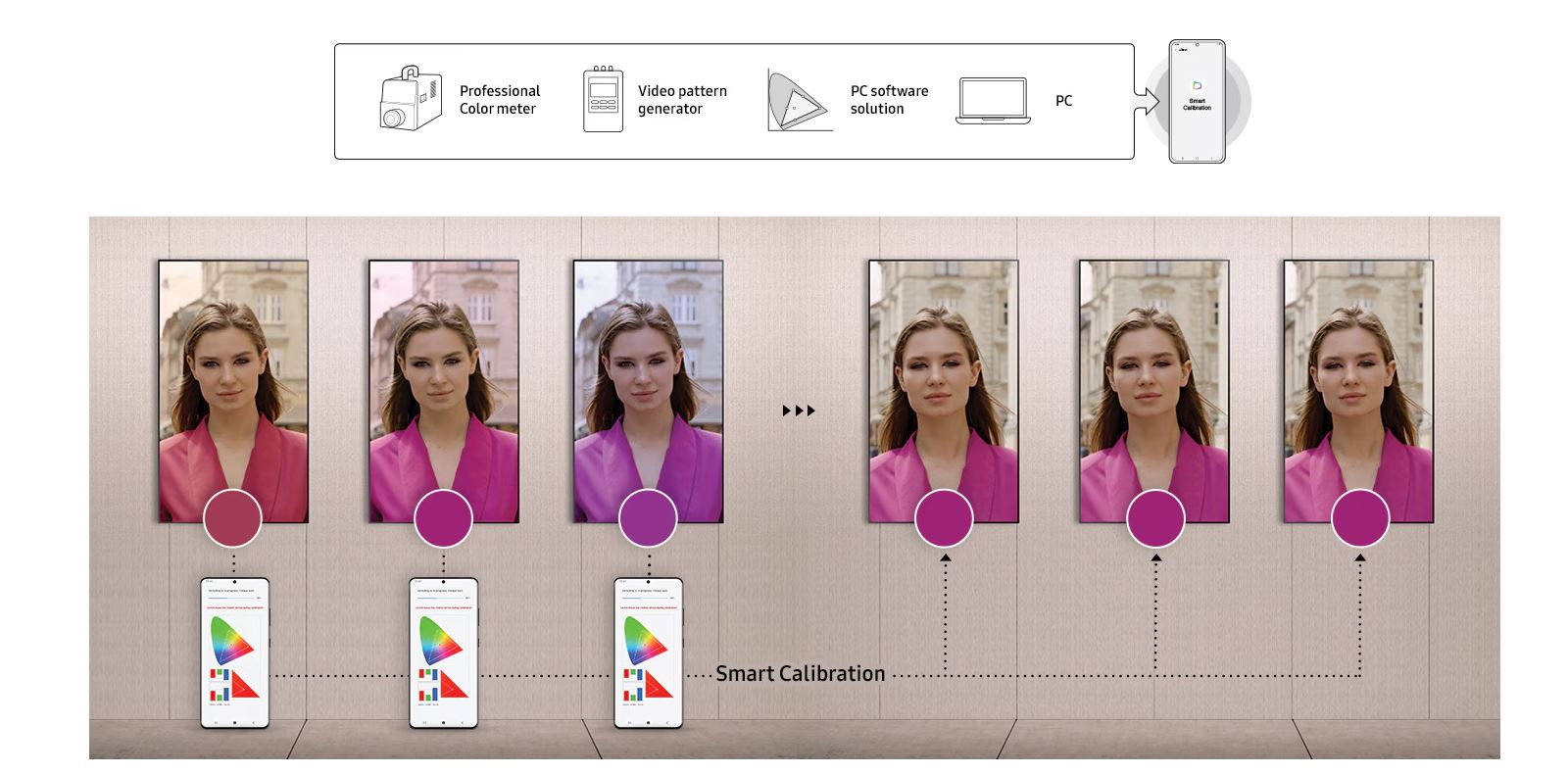 Docilte dokonalé jednoty v rámci propagaci vaší značky – na každém displeji, na každém místě. S pomocí intuitivní mobilní aplikace Samsung Smart Calibration je každý displej správně kalibrován a zobrazuje loga značky a další reklamní materiály v přesně požadovaných barvách.