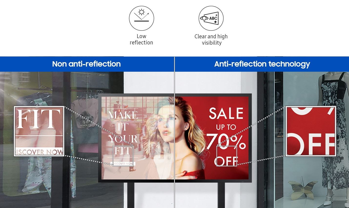 Zařízení Samsung OH46B-S je vybaveno ochranným sklem Magic Protection Glass, které využívá pokročilou technologii potlačování světelných paprsků, dopadajících na jeho displej. Toto inovativní řešení zajišťuje mnohem lepší viditelnost při sledování za denního světla s výrazně nižší celkovou mírou odrazu, což zaručuje jasnější obraz a text pro každého diváka.
