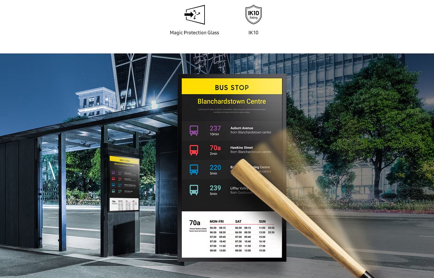 Samsung OH46B-S je vybaven tvrzeným ochranným sklem Magic Protection Glass, které je odolné a splňuje třídu IK10, čímž zajišťuje vysokou bezpečnost a ochranu proti vnějším nárazům. Tím je výrobek chráněn před náhodným poškozením, což dává personálu vaší prodejny větší možnosti v jeho použití, aniž by se musel strachovat o jeho stav.