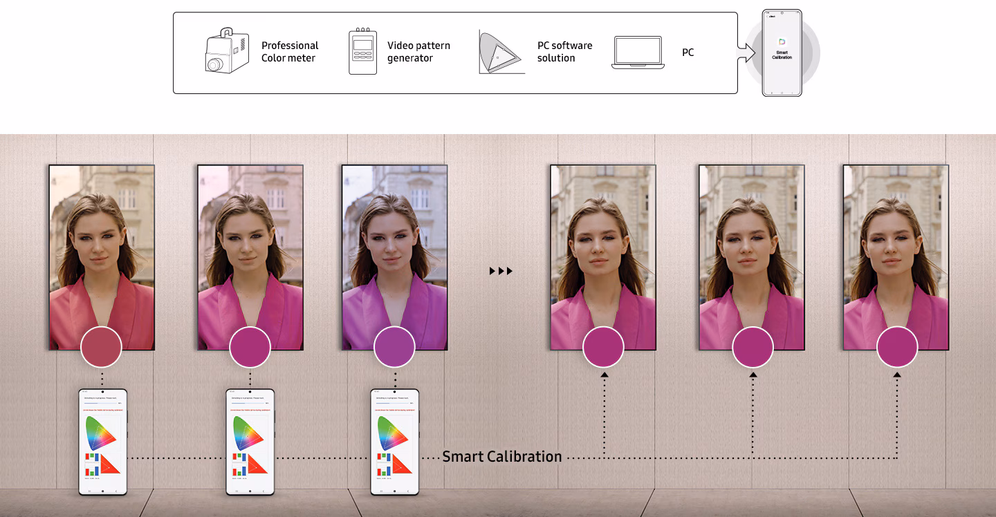 Docilte dokonalé jednoty v rámci propagaci vaší značky – na každém displeji, na každém místě. S pomocí intuitivní mobilní aplikace Samsung Smart Calibration je každý displej správně kalibrován a zobrazuje loga značky a další reklamní materiály v přesně požadovaných barvách.