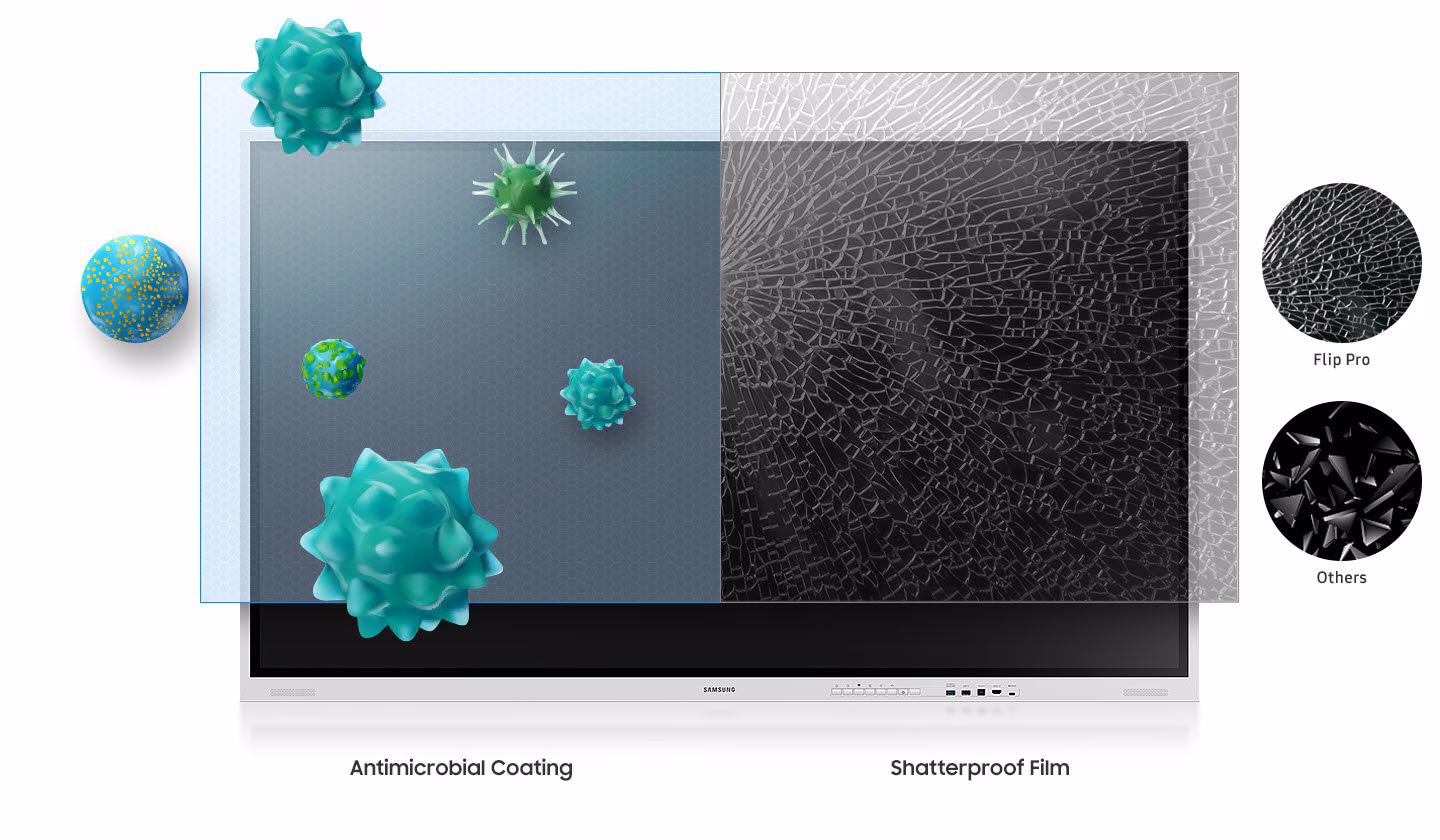 Se Samsung Flip Pro se nemusíte bát mikrobů, a to díky zabudovanému antimikrobiálnímu plášti, který zamezí jejich šíření. Displej je navíc chráněn patentovaným netříštivým filmem zajišťujícím, že obrazovka zůstane neporušená i v případě poškození.