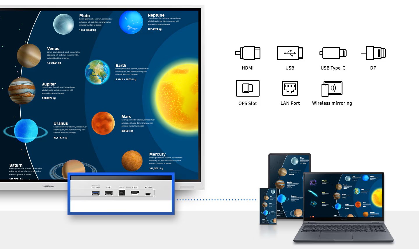 Flip Pro poskytuje několik možností připojení, včetně USB, HDMI, DP nebo OPS slotů. Vyučující mohou snadno přidat jakékoliv zařízení pro přístup k obsahu a zobrazení informací na větší ploše, stejně, jako se připojit k jakékoliv síti a dalším zařízením prostřednictvím LAN a bezdrátového zrcadlení obrazovky.