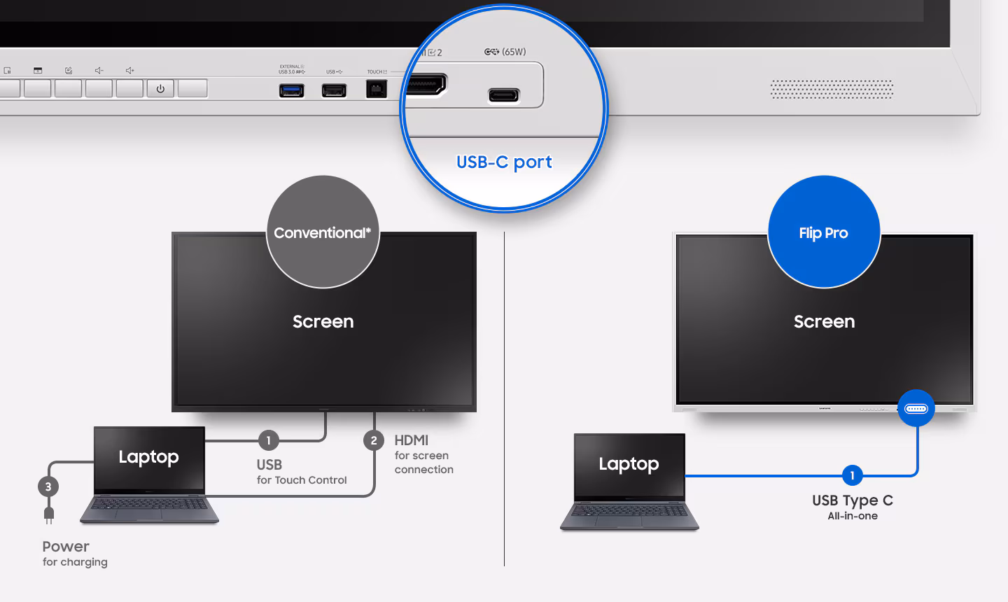 Konektivita je zdokonalená díky 3 v 1 USB-C portu, který umožňuje zrcadlení plochy, dotykové ovládání nebo třeba nabíjení externího zařízení (max 65W). Prostřednictvím USB-C portu se mohou vyučující připojit a odučit interaktivní a zábavnou hodinu, aniž by cokoliv narušovalo její průběh.