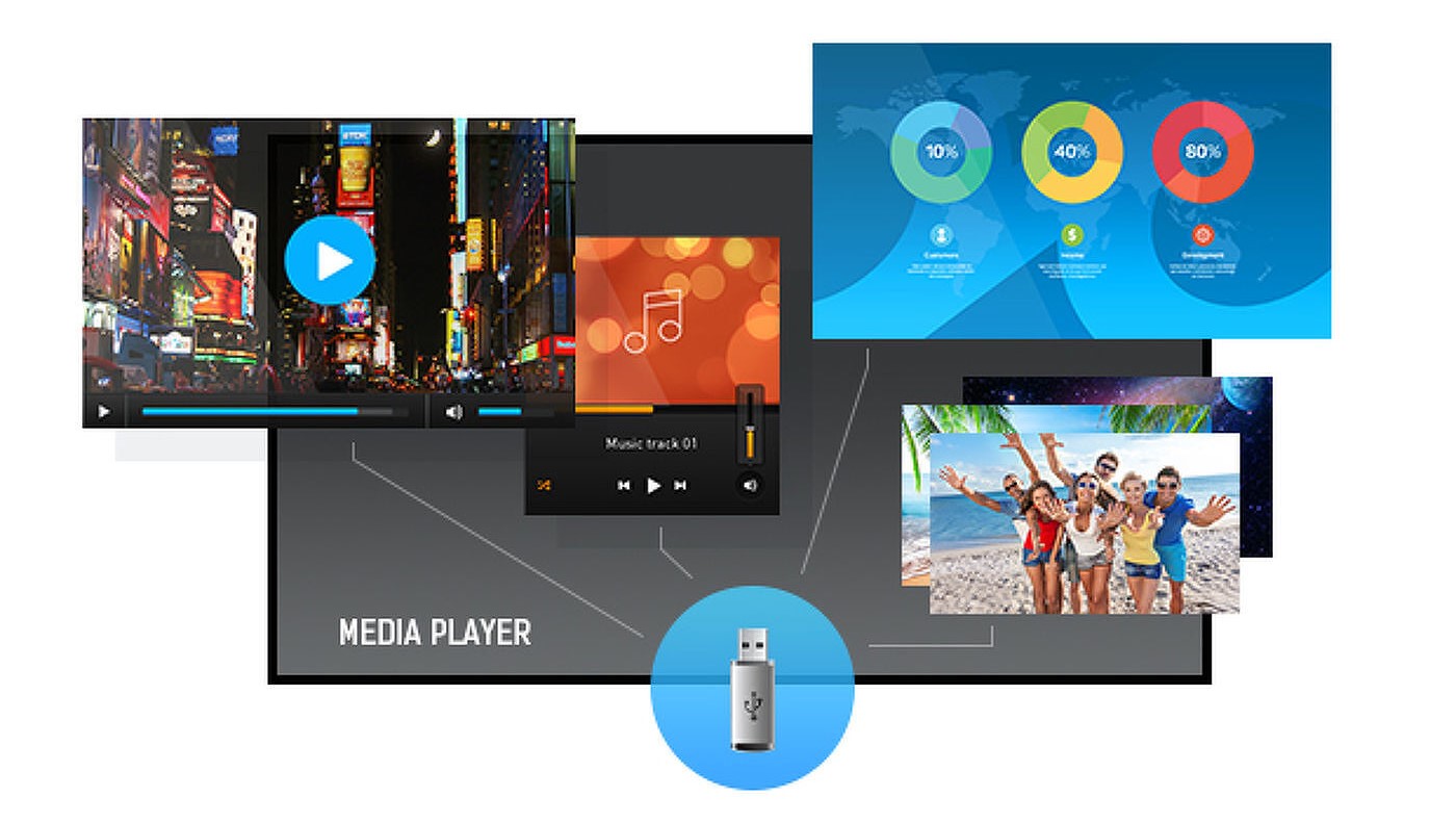 Přehrávejte svou oblíbenou hudbu a ukažte své nejkrásnější videa, fotografie a obrázky přímo na obrazovce z flash disku nebo interní paměti pomocí vestavěného přehrávače médií.