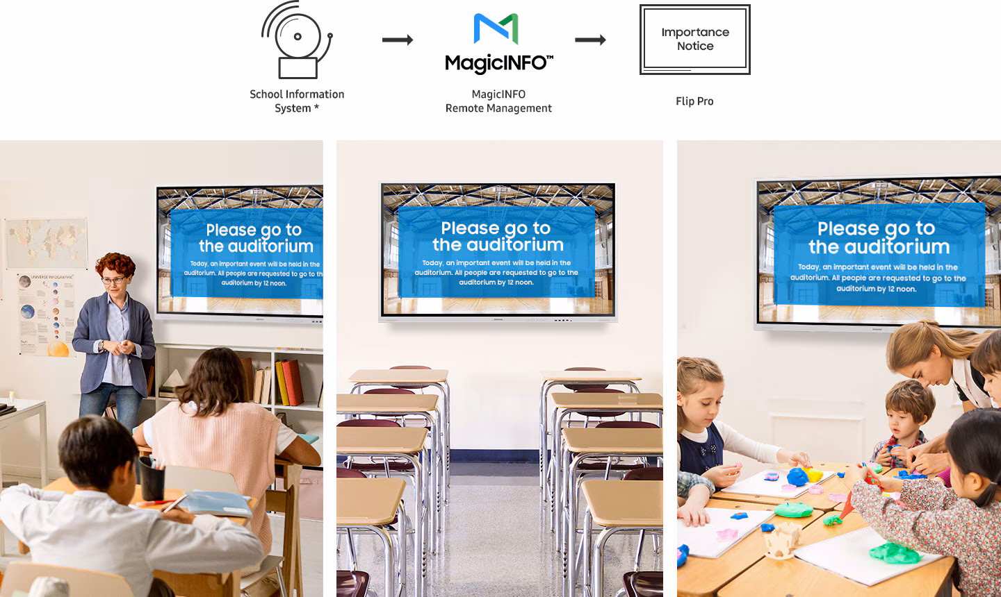 S využitím služby Samsung MagicINFO Remote Management nabízí Flip Pro nová řešení zobrazení obsahu, upozornění a varování ze školního informačního systému přímo na obrazovku. Vyučující a studenti v jednotlivých třídách s Flip tabulí obdrží důležité informace přímo na její plochu.