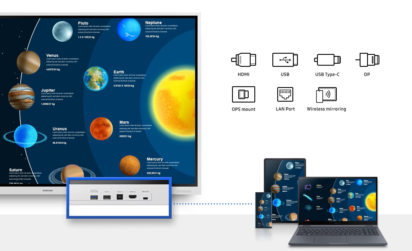 Flip Pro poskytuje několik možností připojení, včetně USB, HDMI, DP nebo OPS slotů. Vyučující mohou snadno přidat jakékoliv zařízení pro přístup k obsahu a zobrazení informací na větší ploše, stejně, jako se připojit k jakékoliv síti a dalším zařízením prostřednictvím LAN a bezdrátového zrcadlení obrazovky.