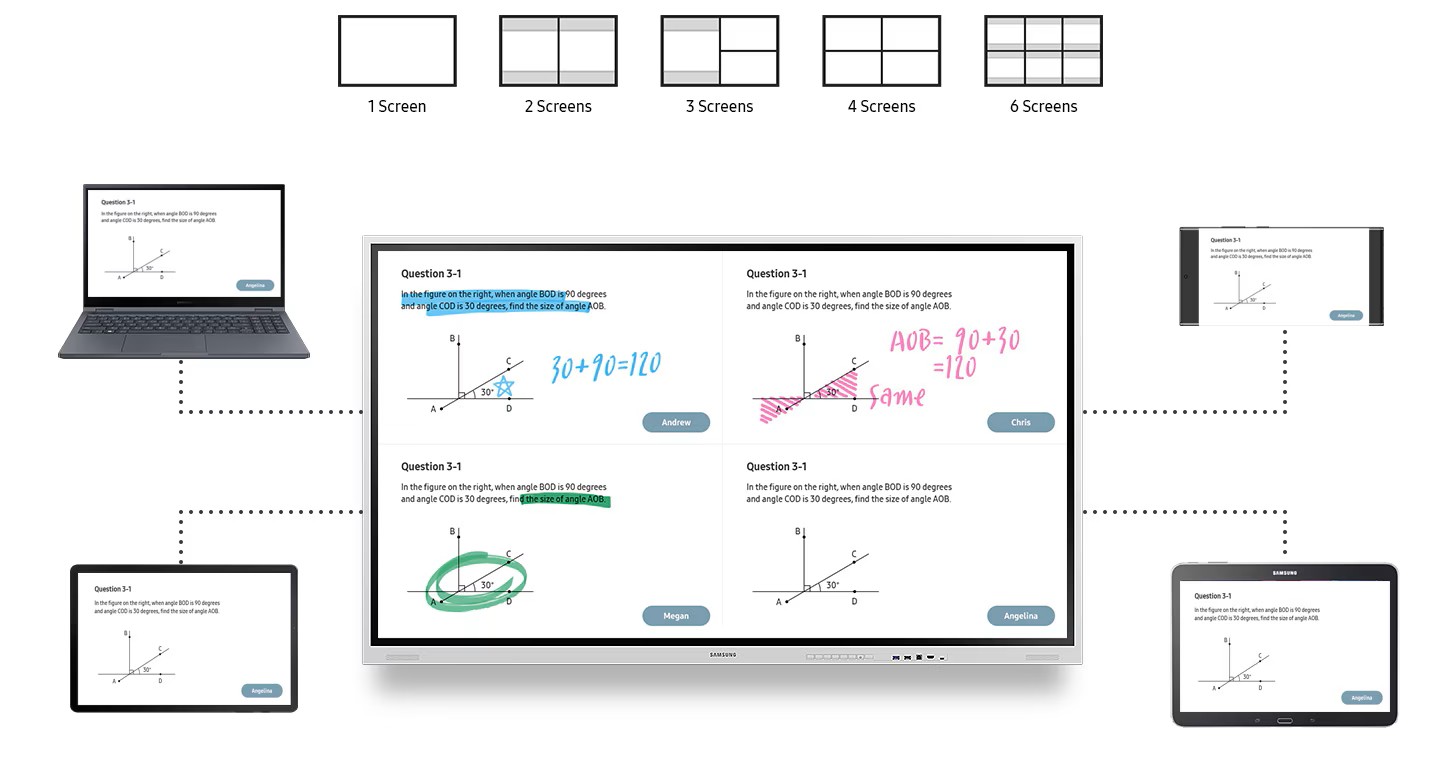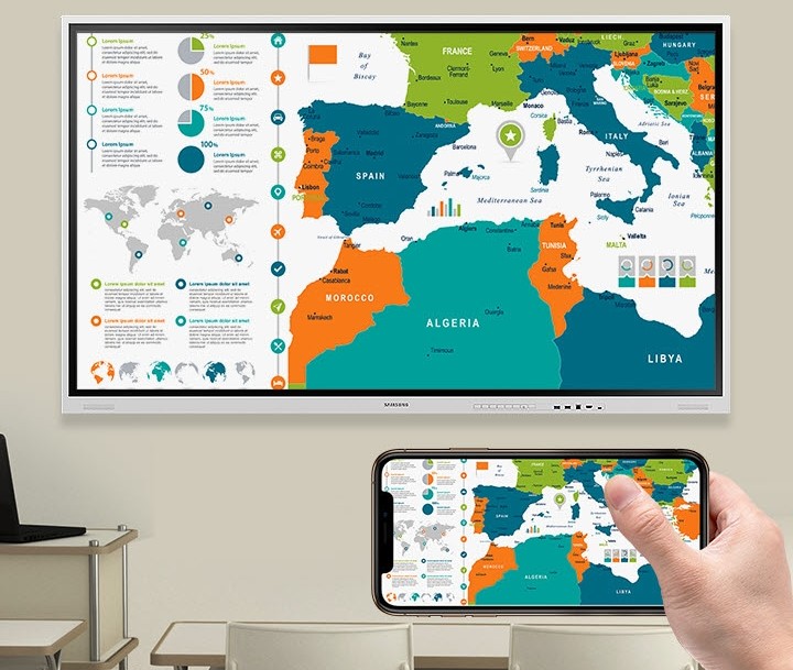 S technologií SmartView+ můžete k obrazovce připojit až 50 zařízení najednou, přičemž multi-view dovolí promítnout až 4 plochy současně. Toto bezdrátové sdílení je ideální pro větší meetingové místnosti nebo digitalizované učebny.