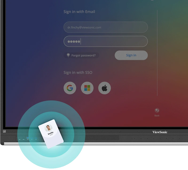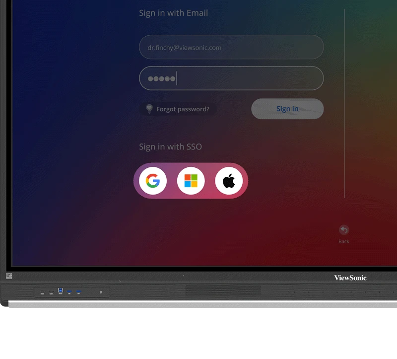Přístup k ViewBoard získáte prostřednictvím účtu myViewBoard nebo pohodlných možností SSO, které umožňují okamžitý přístup k souborům uloženým v cloudu, personalizovaným nastavením aplikací a uloženým záložkám. Díky této efektivní integraci cloudu mohou vaše lekce plynule probíhat bez nutnosti zadávat několik přihlašovacích údajů.