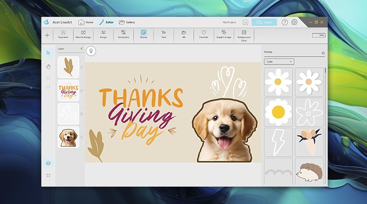 V mžiku odstraňte pozadí obrázků s aplikací Acer LiveArt™ 2.0. Upravujte a vytvářejte nálepky umělé inteligence, které můžete vložit kamkoli, a když vytvoříte snímek obrazovky nebo otevřete obrázek, nabídka aplikace intuitivně vyskočí a nabídne pomoc.
