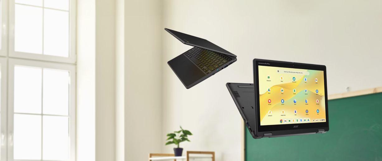 Acer Chromebook Spin 512, špičkový notebook do školy a lídr mezi Chromebooky pro vzdělávání, podporuje výuku díky displeji s nízkým vyzařováním modrého světla podle TÜV, dotykové obrazovce, stylusu a kameře s výhledem na svět. Odolný díky standardu Wi-Fi 7 a modulární konstrukci.