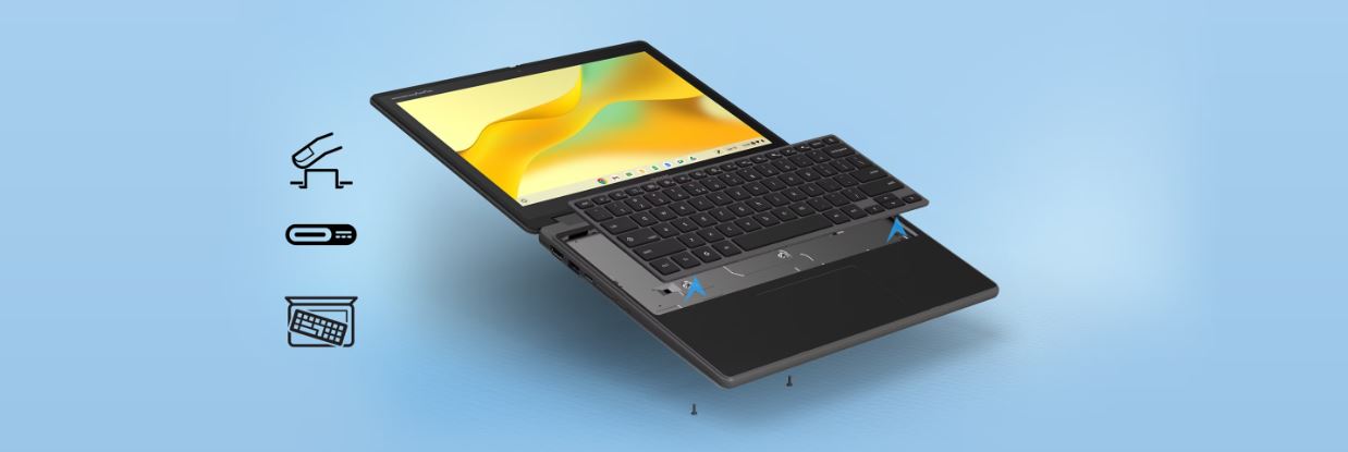 Modulární konstrukce se servisním portem USB-C určeným k nabíjení a vyměnitelnou klávesnicí umožňuje rychlé opravy, čímž se snižuje doba mimo provoz a náklady na vlastnictví. Rychlonabíjecí baterie zajišťuje celodenní napájení při výuce.
