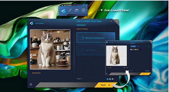 V mžiku odstraňte pozadí obrázků s aplikací Acer LiveArt™ 2.0. Upravujte a vytvářejte nálepky umělé inteligence, které můžete vložit kamkoli, a když vytvoříte snímek obrazovky nebo otevřete obrázek, nabídka aplikace se intuitivně otevře a nabídne pomoc.