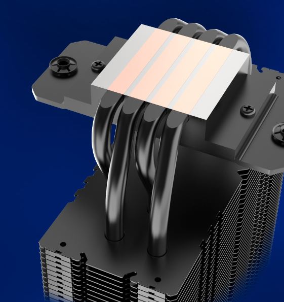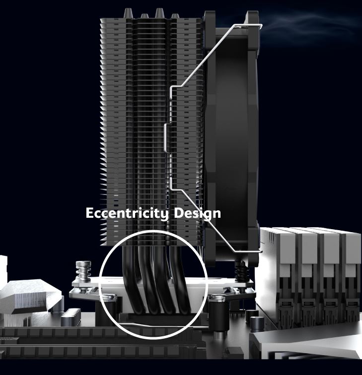4 vysoce výkonné měděné tepelné trubice s technologií Direct Touch (DTT) pro efektivní odvod tepla. Vynikající konstrukce rotoru s hydrodynamickým ložiskem pro lepší mazání, snížení hluku ventilátoru a prodloužení životnosti ventilátoru až na 40 000 hodin. Zajištění, že chladič je schopen podporovat procesory s TDP až 185 W.