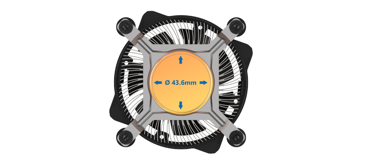 Špičkový hliníkový chladič s dvojitými žebry a velkou měděnou základnou zajišťuje maximální odvod tepla a tepelný přenos. Určen pro procesory s TDP až 125 W. Kompatibilní s paticemi Intel LGA1851 a LGA1700.