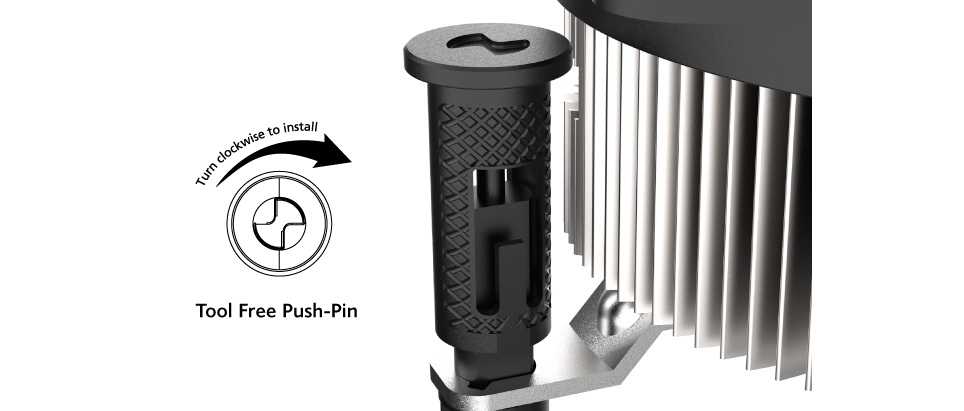 Konstrukce s upevňovacími kolíky umožňuje rychlou, bezpečnou a bezproblémovou instalaci bez nutnosti použití nářadí. Stačí chladič správně vyrovnat a zatlačit kolíky dolů, aby zapadly na místo.