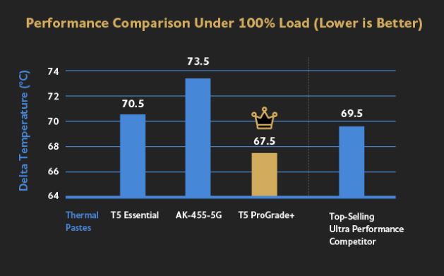 Součástí balení je teplovodivá pasta T5 Pro-Grade Plus s hybridním silikonem a nano-diamantovými částicemi pro ultra-výkon. Překonává ostatní nejprodávanější ultra-výkonné teplovodivé pasty konkurence.