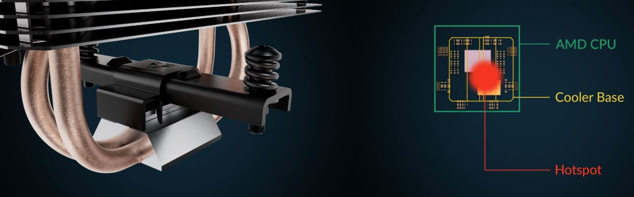 Umožňuje ofsetovou montáž chladiče směrem k bodu CPU, optimalizuje zarovnání pro asymetrické vícečipové CPU a zajišťuje efektivnější přenos tepla.