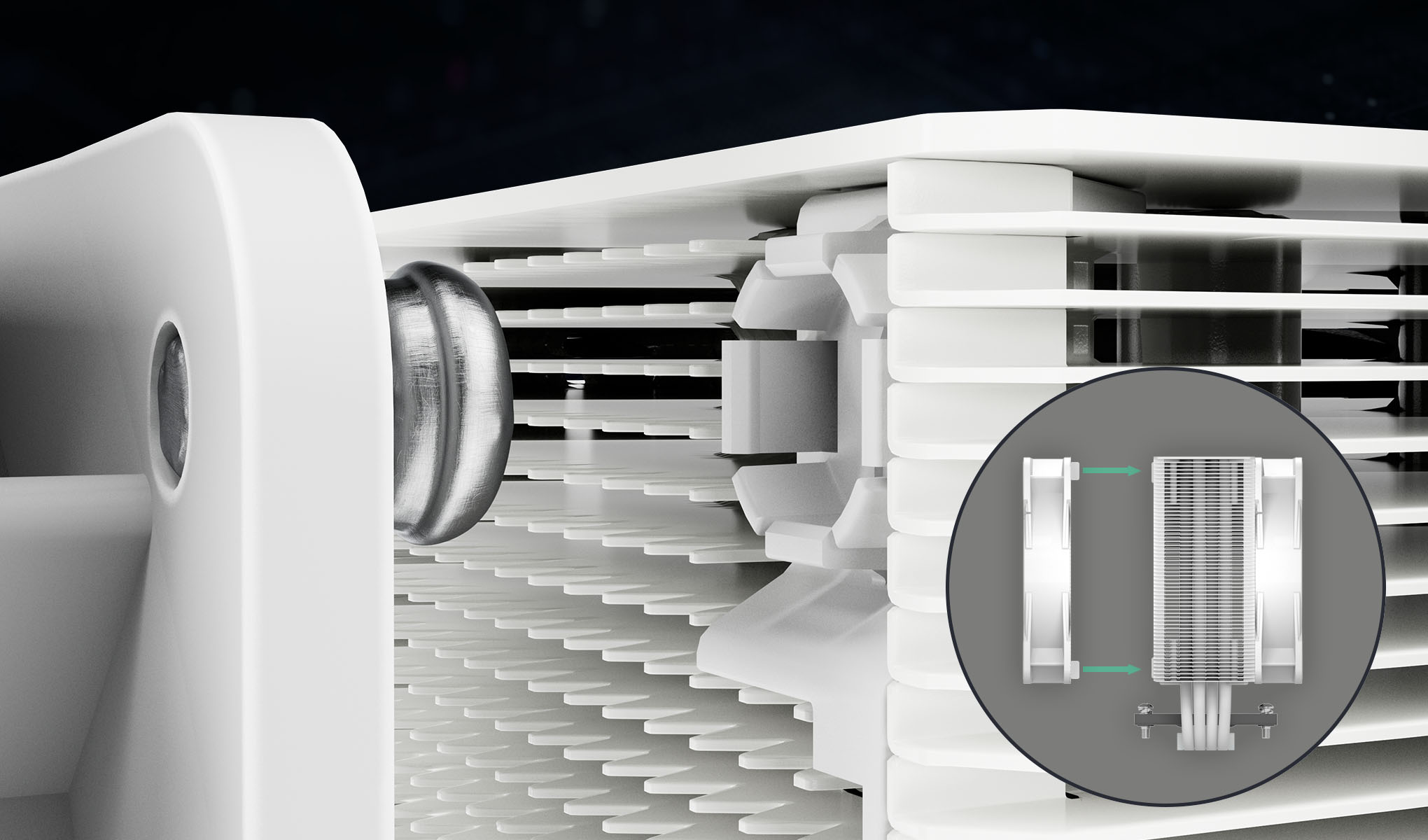 Žebra chladiče jsou po stranách otevřená a umožňují ventilátoru nasávat další chladný vzduch z počítačové skříně přes chladič. Tento design s bočním prouděním vzduchu zajišťuje ještě účinnější větrání.