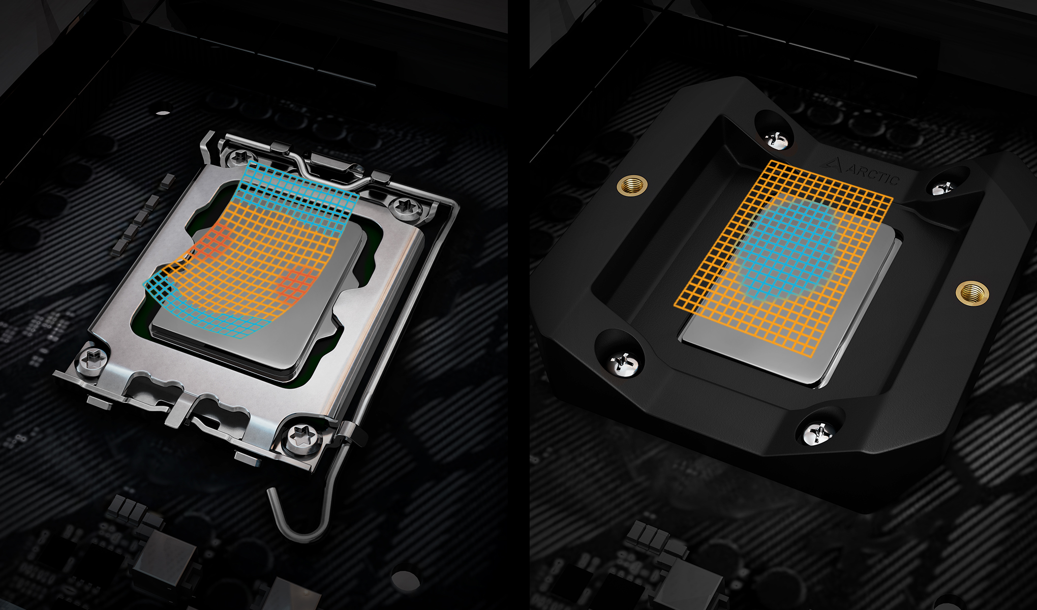 Nezávislý zatěžovací mechanismus (ILM) společnosti Intel deformuje procesor tím, že jej vtlačí do patice ve dvou bodech silou přes 40 kg. To způsobuje tlak na desku plošných spojů, čip a vrstvu pájky mezi čipem a IHS (integrovaným rozvaděčem tepla). Při vysokém tepelném zatížení to může vést k dlouhodobým problémům. Montážní rám od společnosti ARCTIC nedeformuje CPU, výrazně snižuje mechanické zatížení CPU, je rychlý a snadný na instalaci a umožňuje přišroubovat chladič na zadní desku CPU. Výsledkem je minimalizace mechanického namáhání základní desky a CPU, konzistentní chladicí výkon a rychlá a nekomplikovaná instalace.