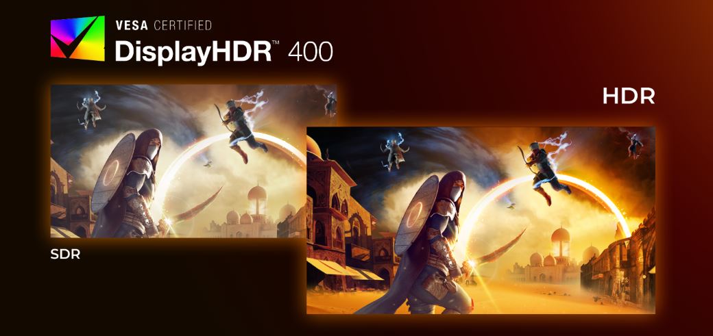 VESA Certified DisplayHDR™ 400 představuje významný pokrok oproti běžným SDR displejům. Na rozdíl od jiných „HDR kompatibilních“ obrazovek nabízí skutečný DisplayHDR™ 400 úžasný jas, kontrast a maximální jas barev až 400 nitů; obrazy ožívají díky výrazným světlým tónům a zároveň hlubším a jemnějším odstínům černé. Zobrazuje plnější paletu nových sytých barev a poskytuje vizuální zážitek, který zapojí všechny vaše smysly.