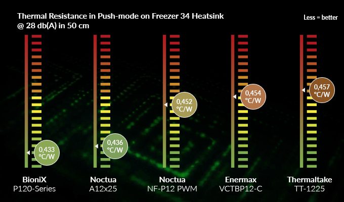 Při vývoji nového modelu BioniX P120 byl kladen zvláštní důraz na soustředěný proud vzduchu a tím i na vysoký statický tlak. Ventilátor zaručuje extrémně účinné chlazení i při zvýšeném odporu vzduchu. Proto je model BioniX P120 obzvláště vhodný pro použití na chladičích a radiátorech.
