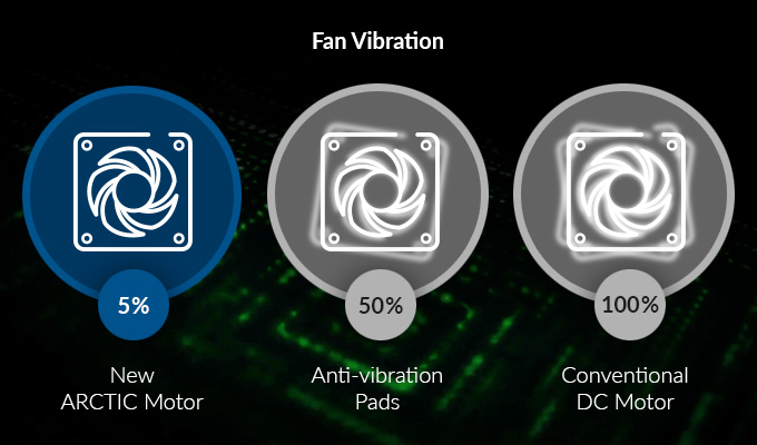 I při nízkých otáčkách je provozní hluk nového motoru ARCTIC sotva slyšitelný. Díky sinusové magnetizaci vytváří nový motor pouze asi 5 % vibrací způsobených komutací běžného stejnosměrného motoru bez filtru. Díky stabilnímu a plynulému točivému momentu nového motoru proto není nutné používat gumové distanční vložky.