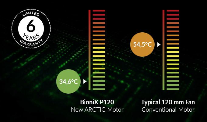 O 10 °C nižší teplota motoru zhruba zdvojnásobuje životnost ventilátoru. Nový motor ARCTIC má díky nízké teplotě cívky čtyřikrát delší životnost. Proto poskytujeme výrobní záruku 6 let.