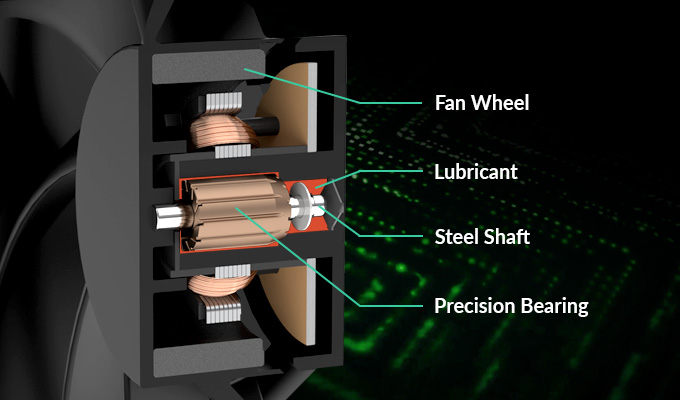 Díky kombinaci slitiny a maziva vyvinuté v Německu je tření v ložisku sníženo a je dosaženo vyšší účinnosti. Výsledkem je menší tvorba tepla a menší hlučnost ložiska, což znamená, že si můžete užít delší životnost ventilátoru.