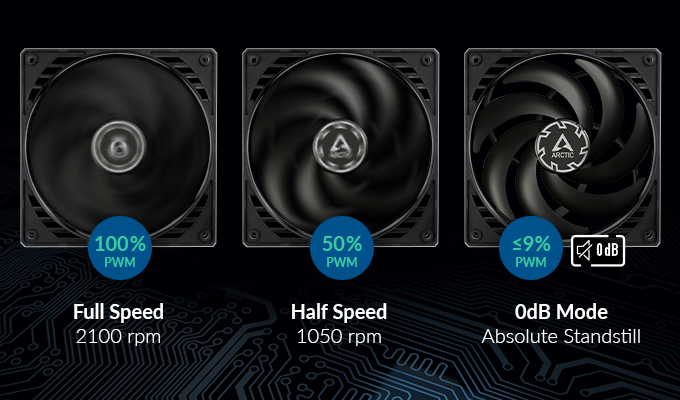 Provozní hluk nově vyvinutého motoru ARCTIC je sotva slyšitelný, a to i při nejnižší rychlosti. Díky speciální magnetizaci motor ventilátorů P-fans nevytváří žádné startovací trhnutí a pouze zlomek komutačních vibrací běžného stejnosměrného motoru. Výsledkem je mnohem menší vibrace na krytu při různých rychlostech a není potřeba gumové tlumení ani dodatečné odpojení.