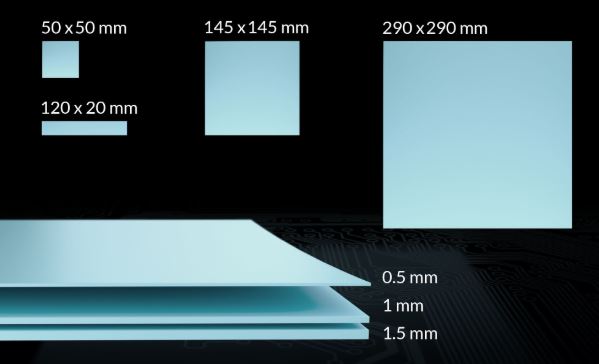 Naše tepelné podložky jsou k dispozici v tloušťkách 0,5 mm, 1,0 mm a 1,5 mm. Díky své štíhlosti je varianta o tloušťce 0,5 mm vynikající alternativou k tepelně vodivé fólii. V závislosti na tloušťce podložek jsou k dispozici v různých velikostech.