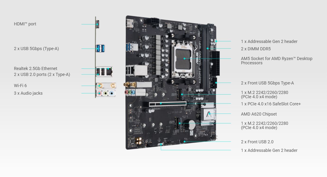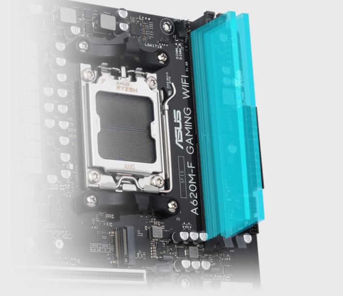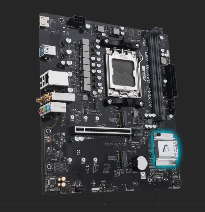 Základní desky řady ASUS A620 jsou odborně navrženy tak, aby plně využily potenciál procesorů AMD Ryzen řady 7000. Díky robustnímu napájecímu systému, komplexním řešením chlazení a inteligentním možnostem ladění nabízí model A620M-F GAMING WIFI uživatelům a stavitelům PC řadu optimalizací výkonu prostřednictvím intuitivních softwarových a firmwarových funkcí. Tato platforma poskytuje výkon a konektivitu, které vyžadují pokročilé aplikace AI pro PC.