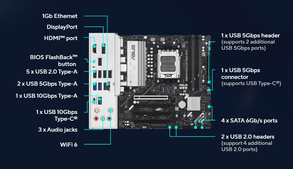 Tato základní deska nabízí všestrannou škálu připojení, včetně podpory WiFi 6E, slotu PCIe 5.0 a arzenálu portů USB včetně připojení typu C.