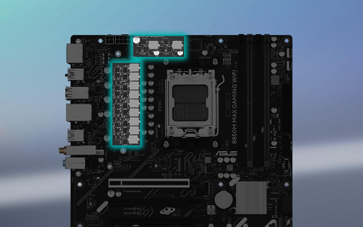B850M MAX GAMING WIFI má 8+2+1fázové napájení s diskrétními tranzistory MOSFET, které zajišťuje efektivní a stabilní napájení procesorů AMD a stabilní výkon pro každodenní používání.