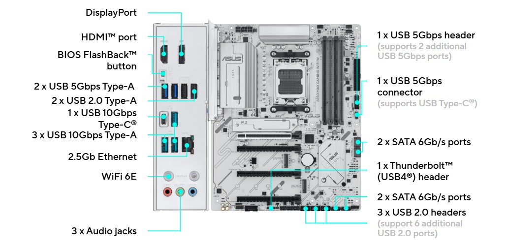 Tato základní deska nabízí všestrannou škálu připojení, včetně podpory WiFi 6E, slotu PCIe 5.0 a arzenálu portů USB včetně připojení typu C.