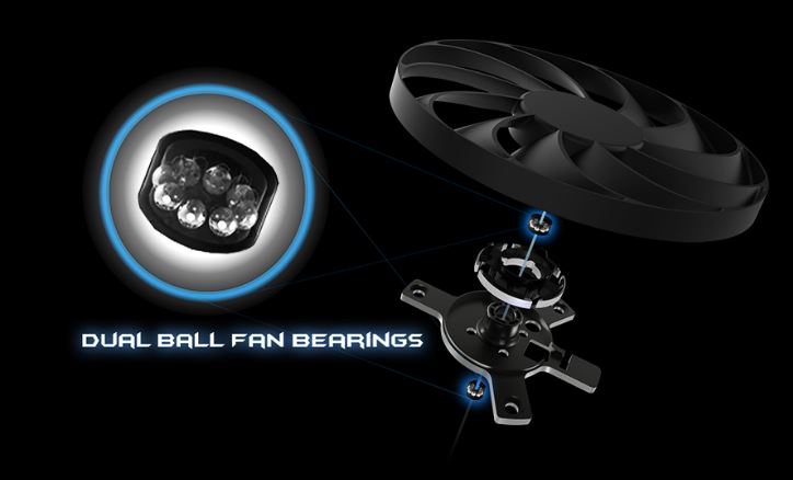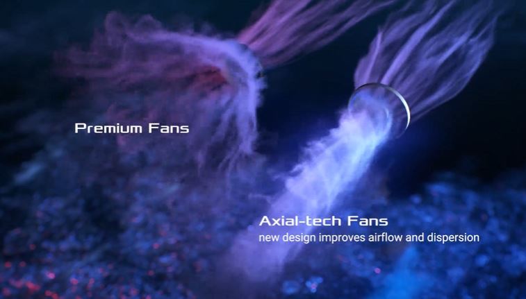 Dva osvědčené ventilátory Axial-tech mají menší střed, který uvolňuje prostor pro delší lopatky, a bariérový kroužek pro zvýšení tlaku vzduchu směrem dolů.