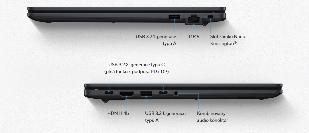 ASUS ExpertBook B1 je vybaven řadou vstupních a výstupních portů pro splnění všech vašich potřeb v oblasti připojení. Obsahuje dva porty USB 3.2 2. generace typu C, které nabízejí plnou funkčnost s podporou Power Delivery a DisplayPort. Kromě toho jsou k dispozici dva porty USB 3.2 1. generace typu A pro standardní zařízení USB. Pro výstup videa je notebook vybaven portem HDMI 1.4b. Potřeby zvuku uspokojí kombinovaný zvukový konektor 3,5 mm. Zabezpečení je navíc vylepšeno slotem pro zámek nano Kensington® a síťové připojení zajišťuje port RJ45.