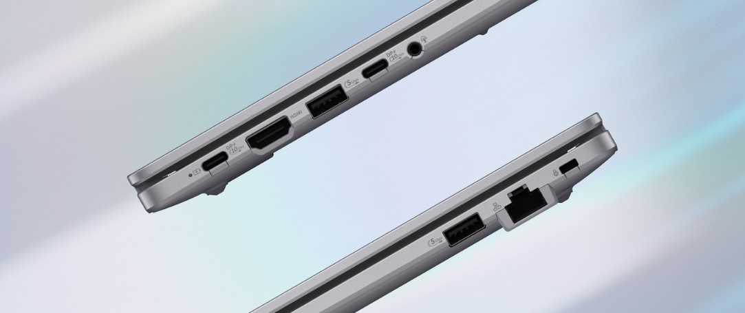 ASUS ExpertBook P1 je vybaven kompletní řadou portů pro splnění všech vašich potřeb v oblasti připojení. Flexibilitu připojení zajišťují dva porty USB 3.2 2. generace typu C, které nabízejí plnou funkčnost s podporou Power Delivery i DisplayPort. Kromě toho jsou k dispozici dva porty USB 3.2 1. generace typu A, abyste mohli snadno připojit stávající nebo starší zařízení USB. Pro výstup videa je ASUS ExpertBook P1 vybaven portem HDMI 1.4b, kdežto potřeby zvuku uspokojí kombinovaný zvukový konektor 3,5 mm. Zabezpečení je také vylepšeno použitím slotu zámku Kensington® Nano a integrovaný port RJ45 je připraven pro rychlé kabelové připojení k síti.