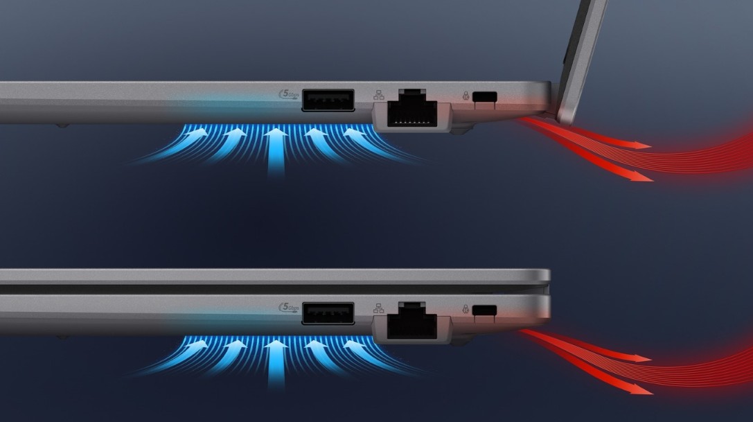 ASUS ExpertBook P1 je také vybaven vylepšeným systémem chlazení, který zajišťuje konzistentní, optimální výkon, ať je kryt otevřený nebo zavřený, a zaručuje špičkovou efektivitu i při dlouhodobém používání. Díky tomuto designu ExpertCool je teplo navíc směrováno do zadní části zařízení, což zabraňuje proudění teplého vzduchu na ruku při používání myši.