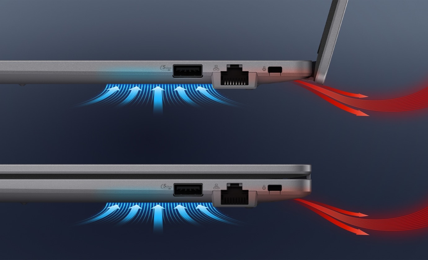 ASUS ExpertBook P1 je také vybaven vylepšeným systémem chlazení, který zajišťuje konzistentní, optimální výkon, ať je kryt otevřený nebo zavřený, a zaručuje špičkovou efektivitu i při dlouhodobém používání. Díky tomuto designu ExpertCool je teplo navíc směrováno do zadní části zařízení, což zabraňuje proudění teplého vzduchu na ruku při používání myši.