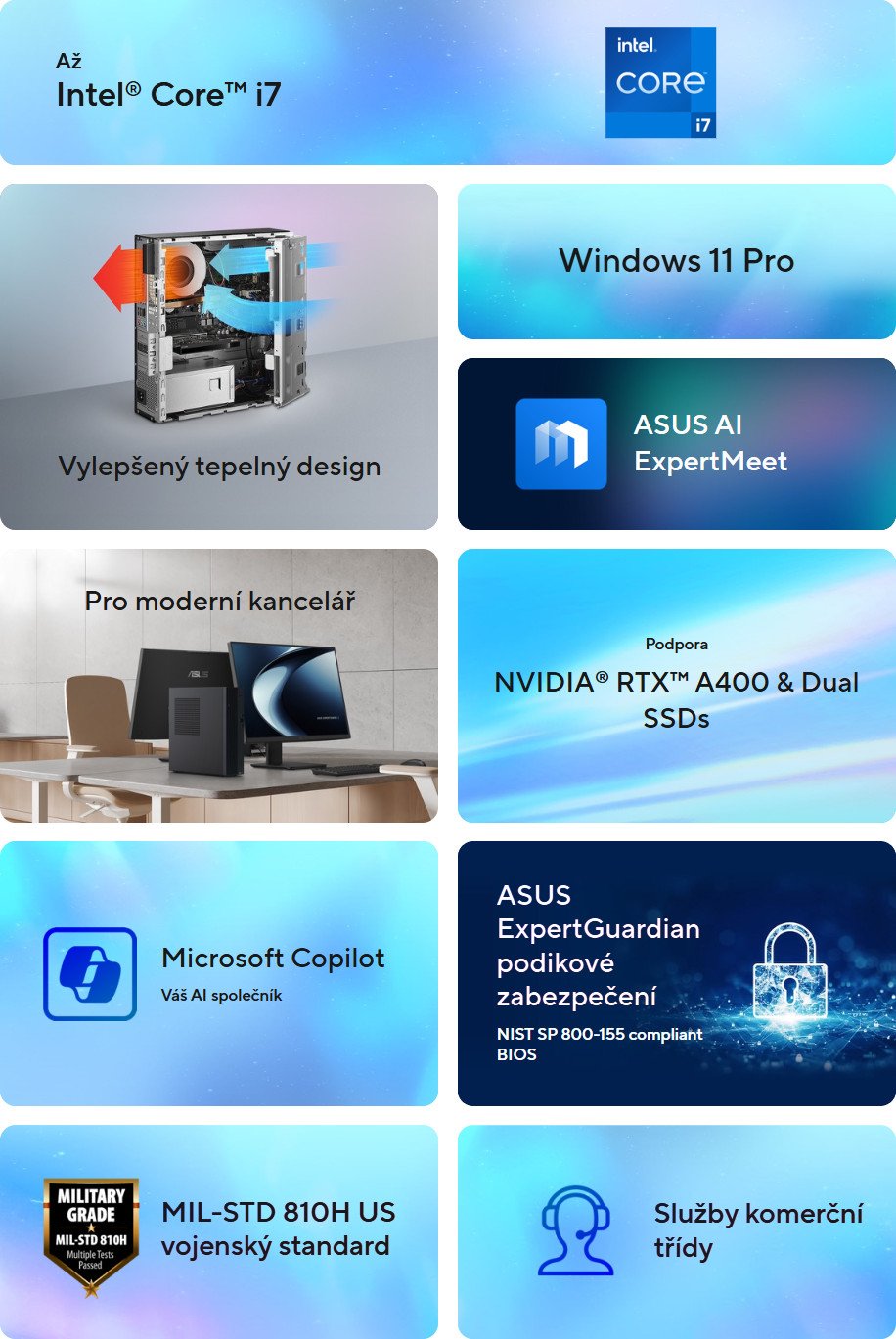 ASUS ExpertCenter P500 SFF kombinuje vysoký výkon, zabezpečení firemní úrovně a funkce komerčních služeb v kompaktním a elegantním provedení a poskytuje tak malým a středním firmám s omezeným rozpočtem flexibilní a organizované pracovní prostředí. Je navržen tak, aby odolal náročným podmínkám a splňoval vojenské standardy USA MIL-STD-810H., je vybaven beznářadovým a rozšiřitelným šasi, což zajišťuje dlouhodobou spolehlivost a pohodlné upgrady pro profesionály.